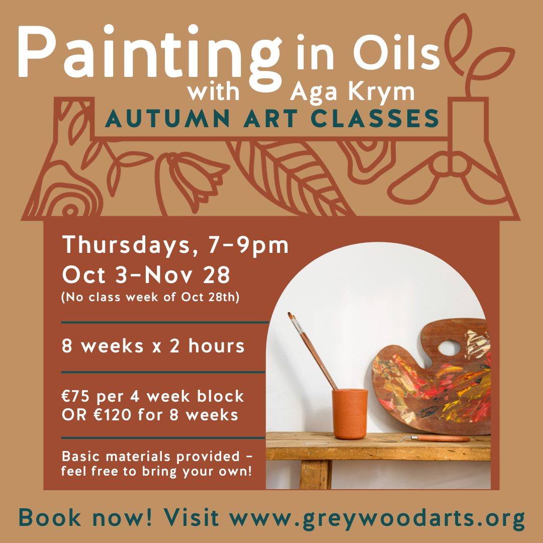 This 8 week course will lead participants through the basic techniques of painting in oils, explorations into colour theory, understanding light and shadow, developing techniques in perspective and composition & creating atmosphere in your paintings. Agnieszka Krym is a practising visual artist who works primarily as a painter. She has a keen interest in evaluating the emotional meaning of landscape in her work and has exhibited both in Ireland and Poland.