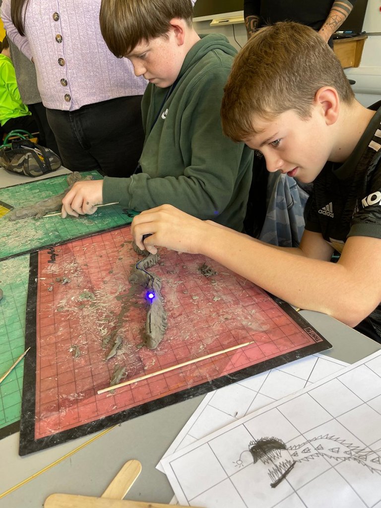 In 2021, visiting artist Scott Gorham used world building, sculpture and digital media techniques to generate projects with the students that explored language creation, geography, and the biology of an alternative dimension. He used 3D scanning to create a digital aspect of the exhibition, and the student’s digitized projects were sent to space during the exhibition at the NSC. You can learn about this project at https://www.hellofutureworld.ie/